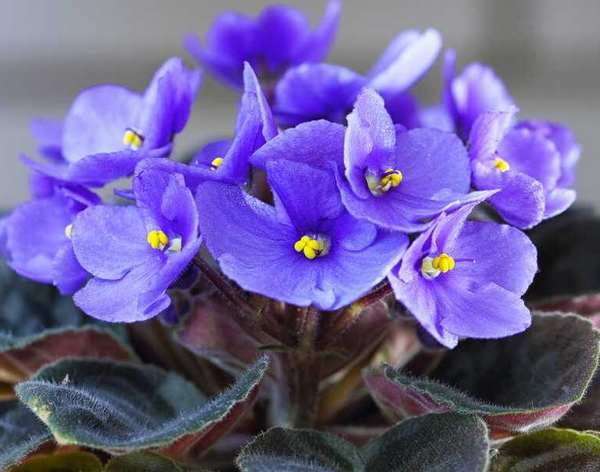 Vytvára nízku ružicu okrúhlych listov, vyrastajúcich na dlhých dužinatých stonkách. Listy sú chlpaté, so zvlnenými okrajmi, tmavozelené, niekedy až s modrým nádychom. Stonky listov a spodok listov bývajú sfarbené do červena. Nové listy vyrastajú rastline počas celého roka. Nad listami sa dvíhajú kvetné strapce, štandardne modrofialovej farby, ale bývajú aj biele, bordové a rôzne ružové odtiene, vždy s výrazným žltým stredom. Záleží od kultivaru, ale bežne dorastajú do výšky 15 cm.