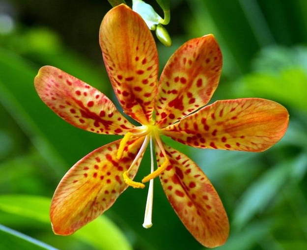 Pochádza z Ázie, z tropických oblastí. Svojím vzhľadom veľmi pripomína kosatce, má žiarivo žlté až oranžové tigrované kvety, ktoré vydržia kvitnúť veľmi dlho. Je vhodná pri liečbe zápalov priedušiek, hrdla, horných dýchacích ciest. Rozpúšťa hlien, využíva sa pri horúčkach, vírusoch, reume. Na liečbu sa používajú hlavne listy a koreňové odnože. Pozor - rastlina môže byť vo väčších dávkach jedovatá.