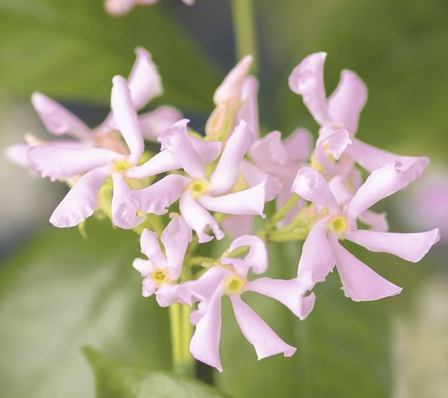 Hviezdicový jazmín, Trachelospermum jasminoides , je drevitá, vždyzelená popínavá rastlina s bohatými tmavozelenými listami s panašovanými bielymi okrajmi, ktoré sa v zime sfarbujú do bronzova. Od polovice do konca leta sa pestujú čisto ružovkasté, voňavé kvety. Môže sa pestovať pri stene v miernejších klimatických podmienkach alebo v skleníku či zimnej záhrade v oblastiach náchylných na silné mrazy.